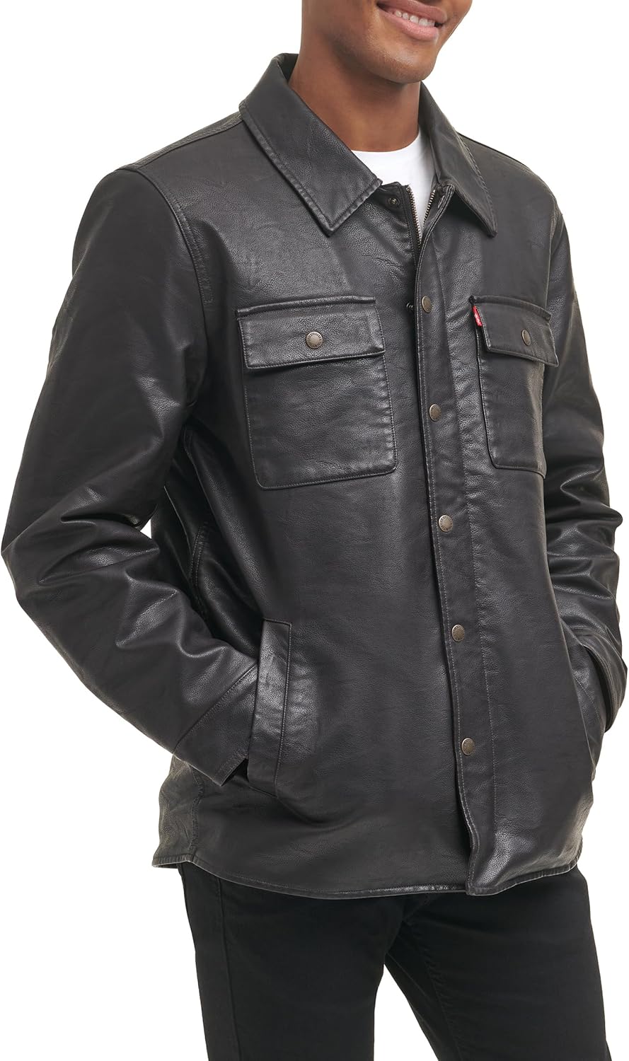 - Faux leather trucker with plaid cotton lining, attached jey hood, adjustable snap cuffs, dual front closure with zipper and snap flap placket for added warmth